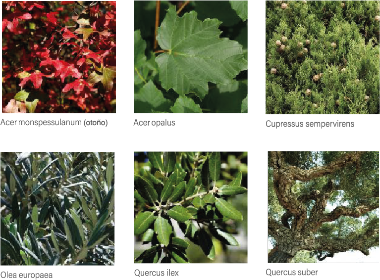 La encina (Quercus ilex) será el árbol unificador, acompañado de especies perennes como Cupressus sempervirens y Quercus suber, junto con árboles de follaje cambiante como Acer monspessulanum y Acer opalus, adaptados a la región bioclimática.