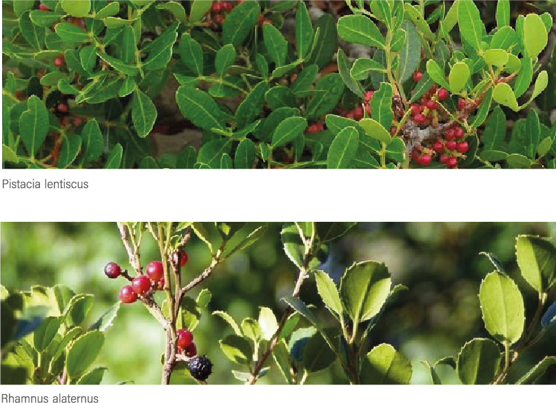Incluimos arbustivas nativas siempre verdes como Pistacia lentiscus y Rhamnus alaternus, que además favorecerán la fauna autóctona, proporcionando alimento a pequeñas aves mediante su fructificación.