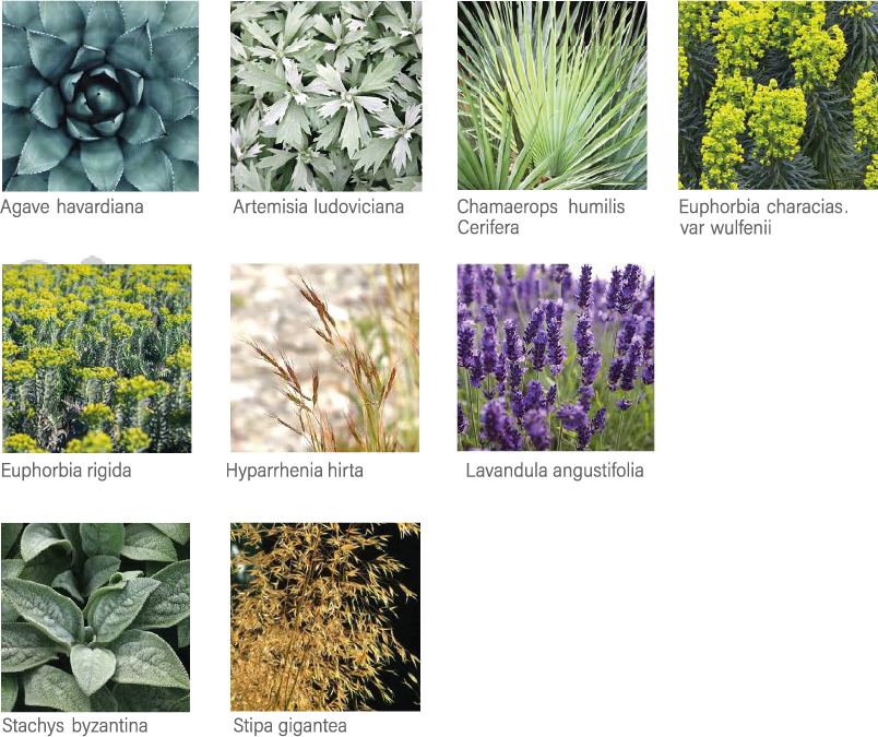 Incluye especies perennes y longevas, usadas en masa o como acentos. Destacan suculentas arquitectónicas como Agave havardiana, gramíneas como Hyparrhenia hirta y Stipa gigantea, y vegetación de follaje y floración atractiva como Lavandula angustifolia, Artemisia ludoviciana ‘Silver Queen’, Euphorbia rigida y la palmera mediterránea Chamaerops humilis ‘Cerifera’.