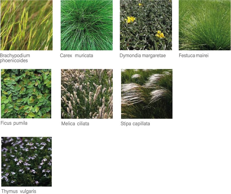 Incluimos gramíneas como Carex muricata, Brachypodium phoenicoides, Melica ciliata y Stipa capillata para cubrir espacios libres. Ficus pumila servirá como tapizante vertical, mientras que Thymus vulgaris y Dymondia margaretae formarán caminos entre las losas.